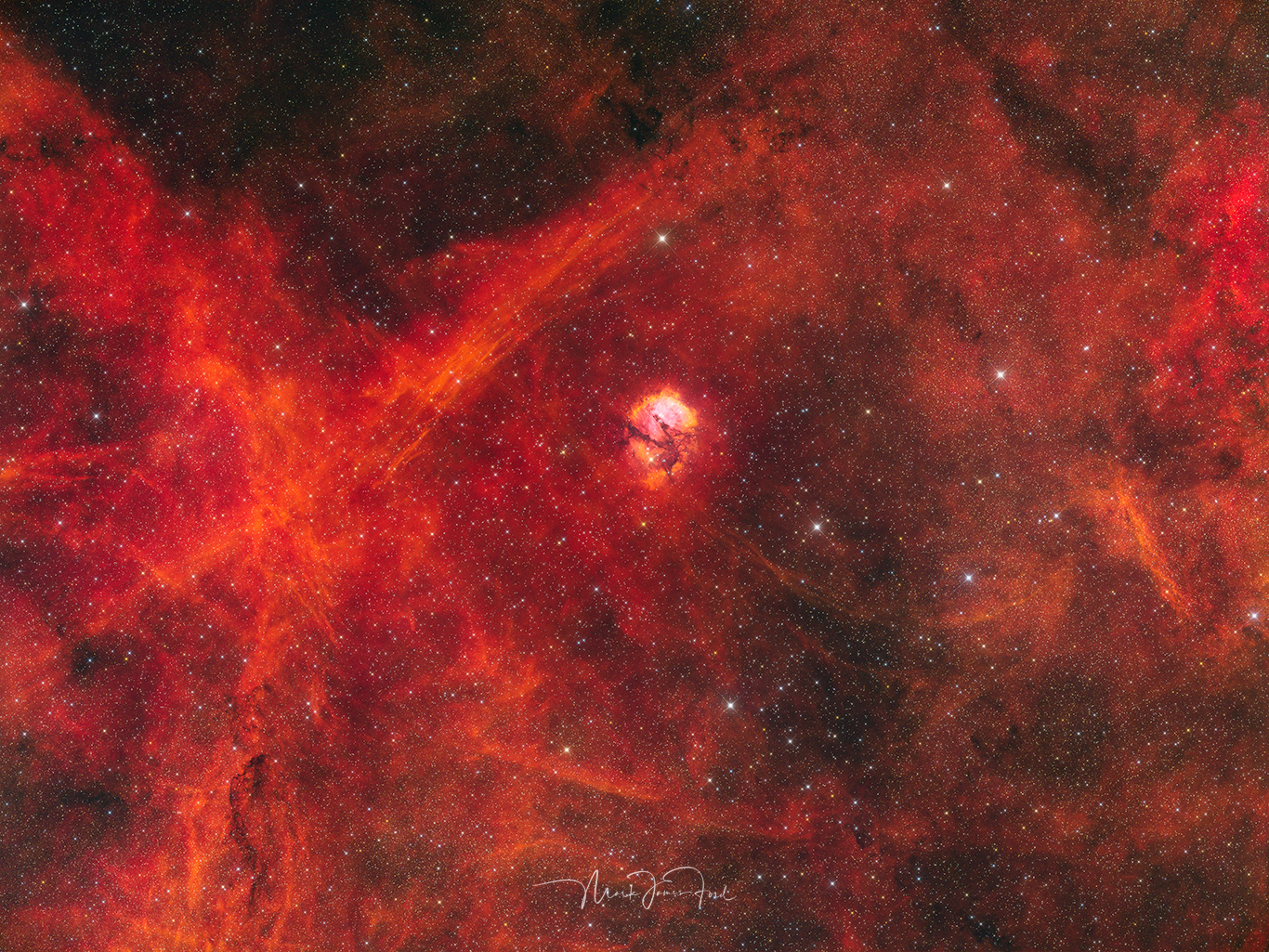 Faint tendrils of hydrogen-alpha emission stretch outward in to the more diffuse gas complex in which Sh2‑3 resides. These outer wisps form part of a larger interstellar cloudscape, connecting Sh2‑3 to neighbouring regions like the Cat’s Paw Nebula (NGC 6334), which lies just a few degrees to the northeast.